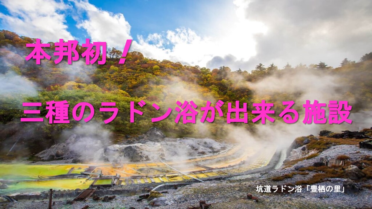 多くの研究結果から、玉川温泉や三朝温泉などのラドン(ラジウム)温泉が奇跡の温泉と言われるのは、この放射線ホルミシス効果によるものであることがわかっており、健康や長寿への応用研究が進められています。